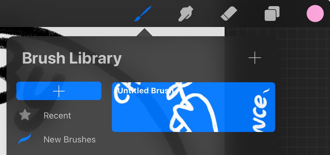 Step 6: If you already have a brush group for your custom brushes go ahead and skip this step. If not, tap the brush icon then swipe down until you see this blue + button. Tap that to create a new group. You can call it whatever you like but I suggest something like “My brushes” or “Custom brushes” so you can easily find it later.
